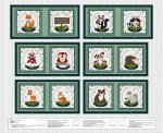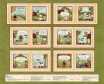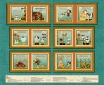 This charming fabric panel features a delightful series of scenes perfect for children's projects. Each square showcases a different moment from a young boy's day, from reading and napping to playing with toys and exploring nature. The illustrations are framed in a rustic brown border, set against a vibrant green background, making the colorful scenes pop with life. The design captures the essence of childhood adventures, making it ideal for creating story quilts, wall hangings, or unique children's room decor.